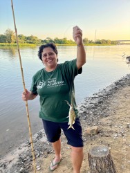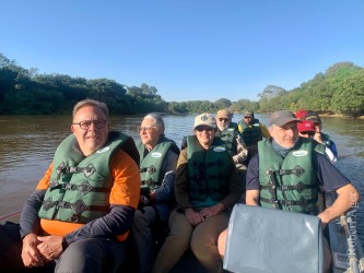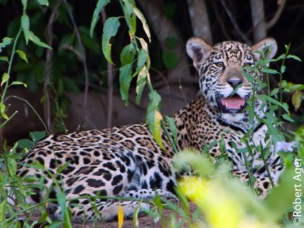 Logo em seguida ouvimos alguém gritando “onça”! Saímos correndo, entramos no barco mais próximo e fomos para o outro lado do Rio Miranda . . . e lá estava ela nos esperando. Uma experiência única e inesquecível, com muita emoção.